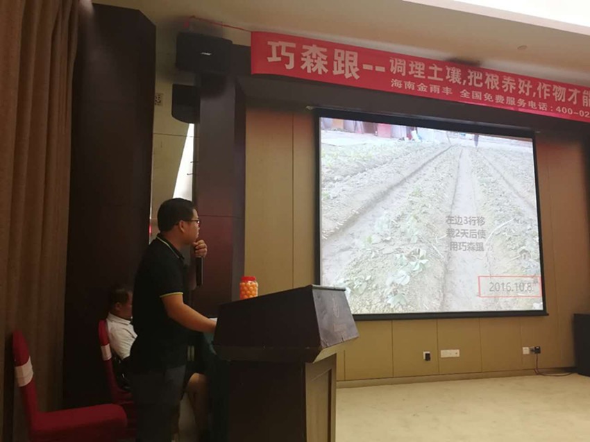 海南金雨丰生物工程有限公司大区经理李孔珍为公司利民新政策作了报告,提及海南金雨丰公司不光是简单的提供产品,还提供了供农户们解决种植问题的办法与方案。
