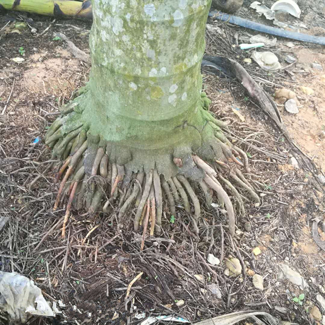 基地杨总按海南金雨丰技术人员指导,从2015年开始每株槟榔用量:“巧森跟®100ml+复合肥500克或1000克”一年一次施用,杆粗树壮直挺,原本树势差的槟榔树长出了新根,分布匀称, 一般都有250条根至350条主根,一条粗根带两、三条细根,而粗根细根增多是保证产量的基本标准;原先枯黄的枝叶也已经转绿了,并且长出了翠绿的新叶;这就是巧森跟®的实在效果——养树养地养根。